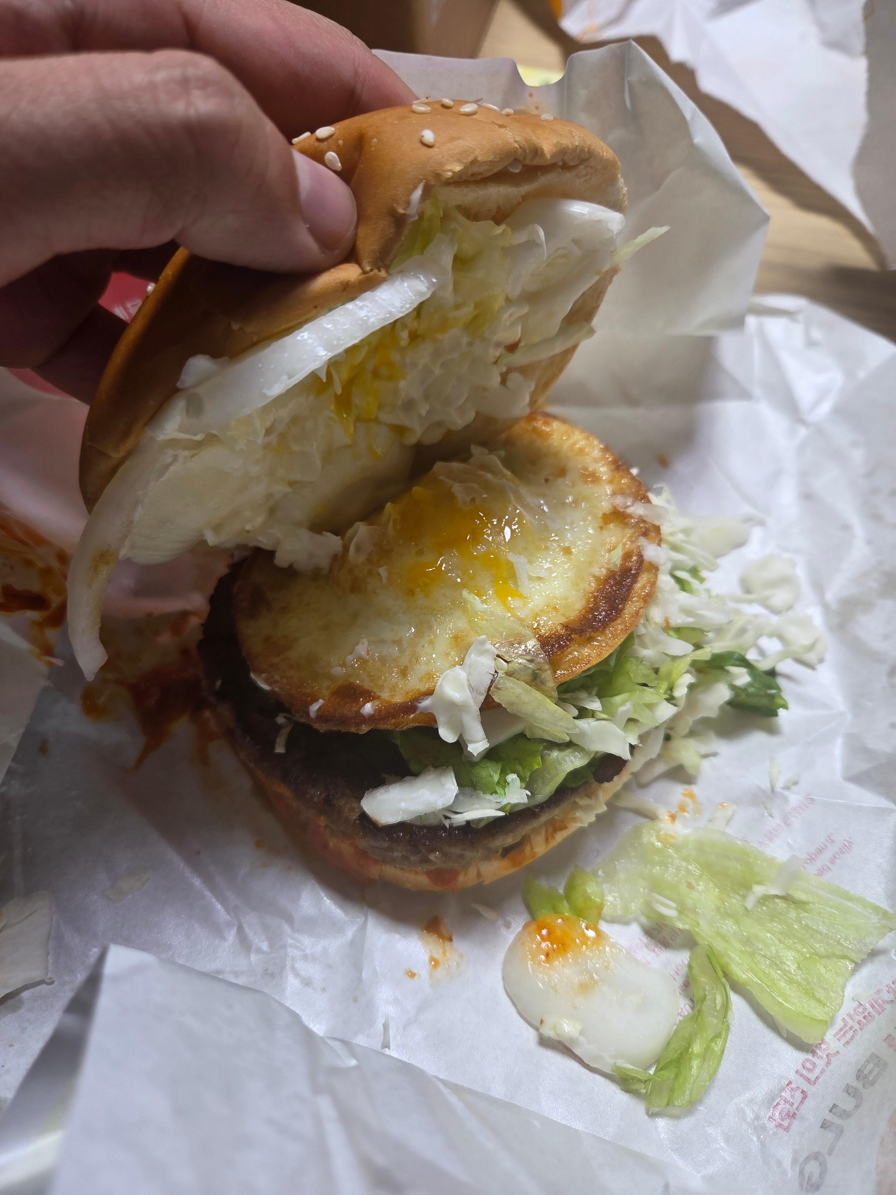 오히려 양상추보다는 식감이 단단해서 씹는 맛이 있고, 불고기 소스랑 김치소스랑 잘 섞이면서 묘하게 고급스러운 느낌을 주기도 하고. 진짜 그냥 임시 대응이 아니라 새로운 스타일의 버거처럼 느껴졌어.